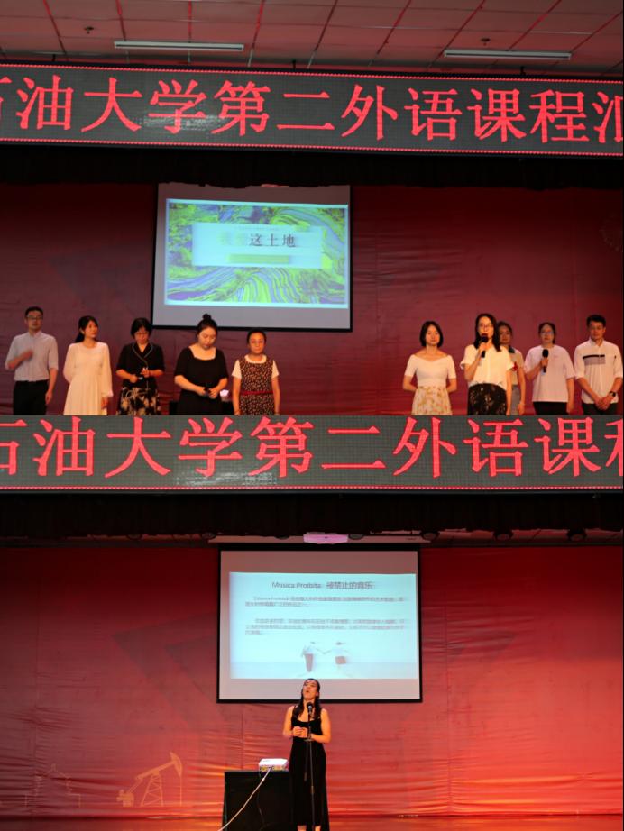 第三部分是由多語種教學部全體教師及英語系鄧林老師、俄語系郭靜遠老師共同帶來的詩朗誦《我愛這土地》,老師們將艾青這首經(jīng)典詩歌以十種不同語言的形式演繹出來,聲情并茂、慷慨激昂。最后一個節(jié)目是由音樂系教師朱玥帶來的意大利語歌曲獨唱,朱玥老師精彩的表演將整個匯報演出推向了高潮,現(xiàn)場掌聲不斷、氣氛熱烈。