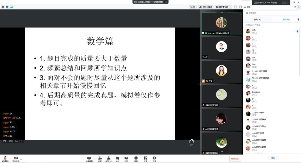 會議首先由輔導(dǎo)員王中立進(jìn)行考研動員介紹,就當(dāng)前畢業(yè)生所面臨的考研形勢進(jìn)行分析,并鼓勵大家堅(jiān)定考研信心,科學(xué)選擇目標(biāo),潛心復(fù)習(xí)備考,爭取順利上岸。18位優(yōu)秀考研畢業(yè)生代表依次進(jìn)行經(jīng)驗(yàn)分享,他們從自身考研經(jīng)歷出發(fā),圍繞如何選取院校專業(yè)、制定復(fù)習(xí)計(jì)劃、調(diào)整備考心態(tài)以及復(fù)試中的注意事項(xiàng)等方面進(jìn)行交流,并著重介紹了考研英語和數(shù)學(xué)科目的學(xué)科特點(diǎn)、知識難點(diǎn)、考試重點(diǎn)、復(fù)習(xí)要點(diǎn),并建議大家在備考途中要以堅(jiān)持不懈的恒心、持之以恒的耐心、百折不撓的信心去面對挫折與挑戰(zhàn),要培養(yǎng)總結(jié)知識的歸納能力,對待錯題、難題、偏題要及時進(jìn)行分類整理與鞏固,日積月累、有效提高。輔導(dǎo)員王璟和王中立對本次考研經(jīng)驗(yàn)交流分享會表示肯定與支持,同時強(qiáng)調(diào)備考同學(xué)要以充足的信心、飽滿的熱情、科學(xué)的方法、合理的計(jì)劃對待艱苦奮斗的考研之路,相信大家通過努力終將實(shí)現(xiàn)夢想。