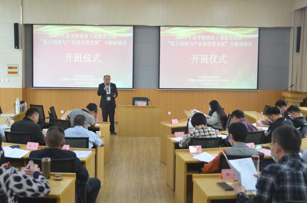 2022年5月18日上午,由省委組織部主辦、我校干訓(xùn)基地承辦的2022年春季陜西省干部教育培訓(xùn)“鏈?zhǔn)絼?chuàng)新與產(chǎn)業(yè)鏈深度發(fā)展”專題研修班,在我校明德校區(qū)培訓(xùn)中心順利開班。繼續(xù)教育學(xué)院副院長吳民生出席開班儀式并致歡迎辭,來自省市黨政機關(guān)的50余名領(lǐng)導(dǎo)干部參加了開班儀式。儀式由班主任康高梅子主持。