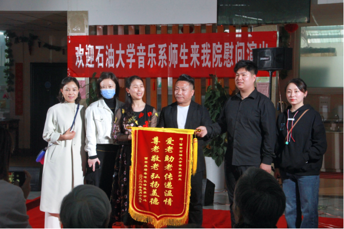本次公益活動中我系還捐贈了米面油等食品,為公益事業(yè)獻出一片愛心,充分體現(xiàn)關(guān)愛老人、尊老愛幼的傳統(tǒng)美德,發(fā)揮黨員的先鋒模范作用。同時利用社會公益平臺向廣大師生傳遞社會責(zé)任感,培養(yǎng)和鍛煉音樂學(xué)子的實踐表演能力和演出經(jīng)驗,在疫情這個特殊的時期為養(yǎng)老院的老人們送上溫暖與關(guān)愛。本次公益活動后春暉長峰醫(yī)養(yǎng)中心還為我系贈送了錦旗,以表達我系長期以來對于養(yǎng)老公益事業(yè)的堅持和付出。