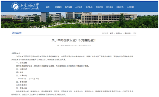411日起,國(guó)家安全教育日到來(lái)前,在疫情防控總體要求下,與校穩(wěn)定辦公室、黨委學(xué)工部、黨委研工部開展“國(guó)家安全知識(shí)競(jìng)賽”答題活動(dòng),積極組織全校廣大師生員工參與線上答題活動(dòng),提升廣大師生員工的國(guó)家安全意識(shí)。