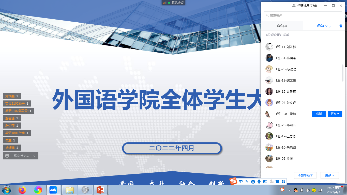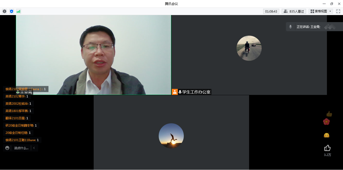 外國語學(xué)院為進(jìn)一步落實(shí)疫情防控工作要求,加強(qiáng)學(xué)院思想政治教育,推進(jìn)學(xué)院班級(jí)建設(shè)工作。4月7日晚通過召開了線上全院學(xué)生會(huì)議。院黨委副書記王業(yè)青,輔導(dǎo)員老師,全體研究生、本科生參加會(huì)議。會(huì)議由院學(xué)生工作辦公室主任周宇主持。
