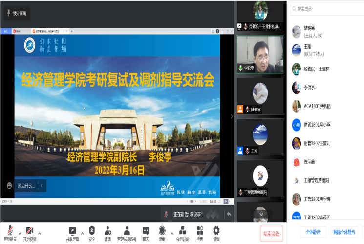 為了提升畢業(yè)生考研復(fù)試與調(diào)劑成功率,3月16日,經(jīng)濟(jì)管理學(xué)院采用騰訊會(huì)議在線上舉辦考研復(fù)試及調(diào)劑指導(dǎo)交流會(huì)。學(xué)院副院長(zhǎng)李俊亭出席會(huì)議并作考研復(fù)試調(diào)劑指導(dǎo),2018級(jí)考研學(xué)生代表50余人參加。會(huì)議由學(xué)院黨委副書記王剛主持。