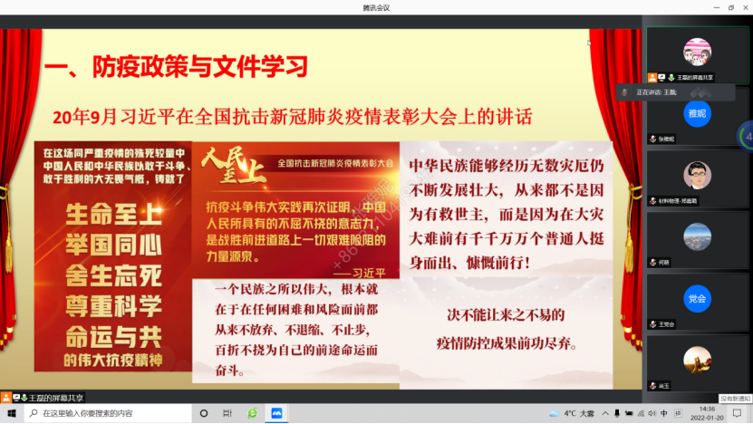 疫情當(dāng)前,為進(jìn)一步充分發(fā)揮黨支部的戰(zhàn)斗堡壘作用和黨員先鋒模范作用,根據(jù)材料科學(xué)與工程學(xué)院黨委“弘揚(yáng)偉大抗疫精神,同心抗疫共克時艱”線上特別主題黨日活動安排,2022年1月20日下午,新材料系教工黨支部開展了線上主題黨日活動,就深入學(xué)習(xí)貫徹習(xí)近平總書記關(guān)于疫情防控的重要講話和指示精神,貫徹落實(shí)中央、省委、省教工委關(guān)于疫情防控的各項(xiàng)決策部署,致敬并學(xué)習(xí)疫情防控中的先進(jìn)典型與先鋒模范,進(jìn)行了深入學(xué)習(xí)與交流探討。