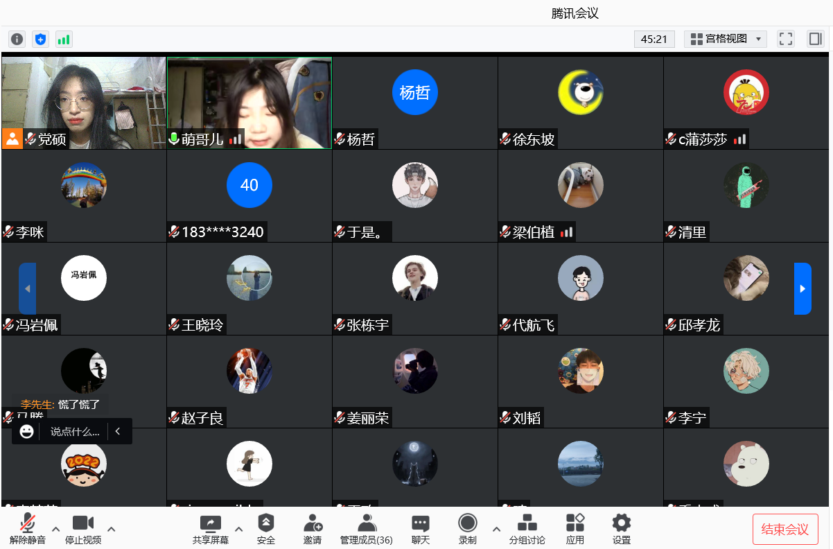 2021級研究生以“疫情防控期間感人事跡分享與當(dāng)前學(xué)習(xí)生活安排”為主題,參會同學(xué)通過分享疫情期間感人事跡、講述本人當(dāng)前學(xué)習(xí)生活安排等方式,積極開展研討交流、互促互進(jìn)。會上,同學(xué)們逐一分享,感知抗疫英雄的力量,傾聽榜樣學(xué)生的日常,學(xué)習(xí)抗疫英雄家國情懷,以抗疫英雄為榜樣,借鑒優(yōu)秀學(xué)生的學(xué)習(xí)科研生活規(guī)劃,努力學(xué)習(xí),勇于攀登,以實(shí)際行動綻放青春力量,做有理想、有本領(lǐng)、有擔(dān)當(dāng)?shù)男聲r代青年。會議主持人何陽針對班級日常管理、疫情防控、學(xué)風(fēng)班風(fēng)建設(shè)等方面存在的問題進(jìn)行了重點(diǎn)要求和倡議。