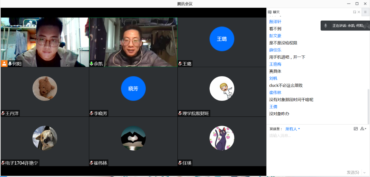 2020級研究生以“講好抗疫故事,宣傳抗疫精神,體現(xiàn)國家擔(dān)當(dāng)”為主題,與會研究生集中學(xué)習(xí)了習(xí)近平總書記關(guān)于疫情防控工作的重要講話和指示精神,通過講述抗疫小故事、分享疫情期間的個人學(xué)習(xí)和生活、探討特殊時期青年學(xué)子如何擔(dān)當(dāng)作為等形式進(jìn)行了深入交流。會議主持人黨碩針對當(dāng)前班級同學(xué)思想動態(tài)、疫情防控、科研學(xué)習(xí)、日常生活等方面提出了建議和要求。
