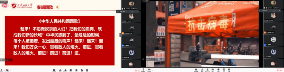 在慷慨嘹亮的國歌、團歌聲中,與會師生通過觀看視頻的方式,體會著不畏艱難、勇往直前的抗疫畫面,大家一起致敬抗疫一線工作者的辛苦付出。疫情突來,三秦遭難,章芯蕊、李旻彤、王鏝婷三位同學分享抗疫故事,讓與會全體師生記住了舍小家為大家堅守奮斗一線的輔警周剛和蒸出一千多個饅頭的“西安好人”張花等抗疫模范。