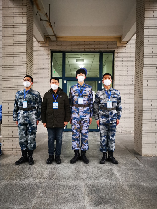 張峻宇(右二)同學(xué)與保衛(wèi)處袁坤老師及隊(duì)員完成封控區(qū)考場(chǎng)任務(wù)
