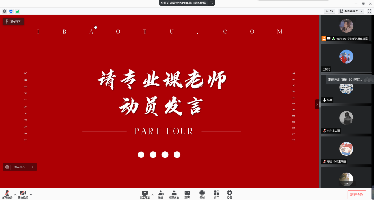 為弘揚抗疫精神,體現(xiàn)青年擔當,經(jīng)濟管理學院2019級市場營銷專業(yè)于1月10日開展“山河無恙、人間有情”線上專業(yè)教育會。經(jīng)濟管理學院院長王君萍、黨委副書記王剛,企業(yè)管理系主任楊晶、班主任袁靜、輔導員王璟以及2019級市場營銷專業(yè)全體同學參與會議。會議由營銷1901班班長吳紅娟主持。