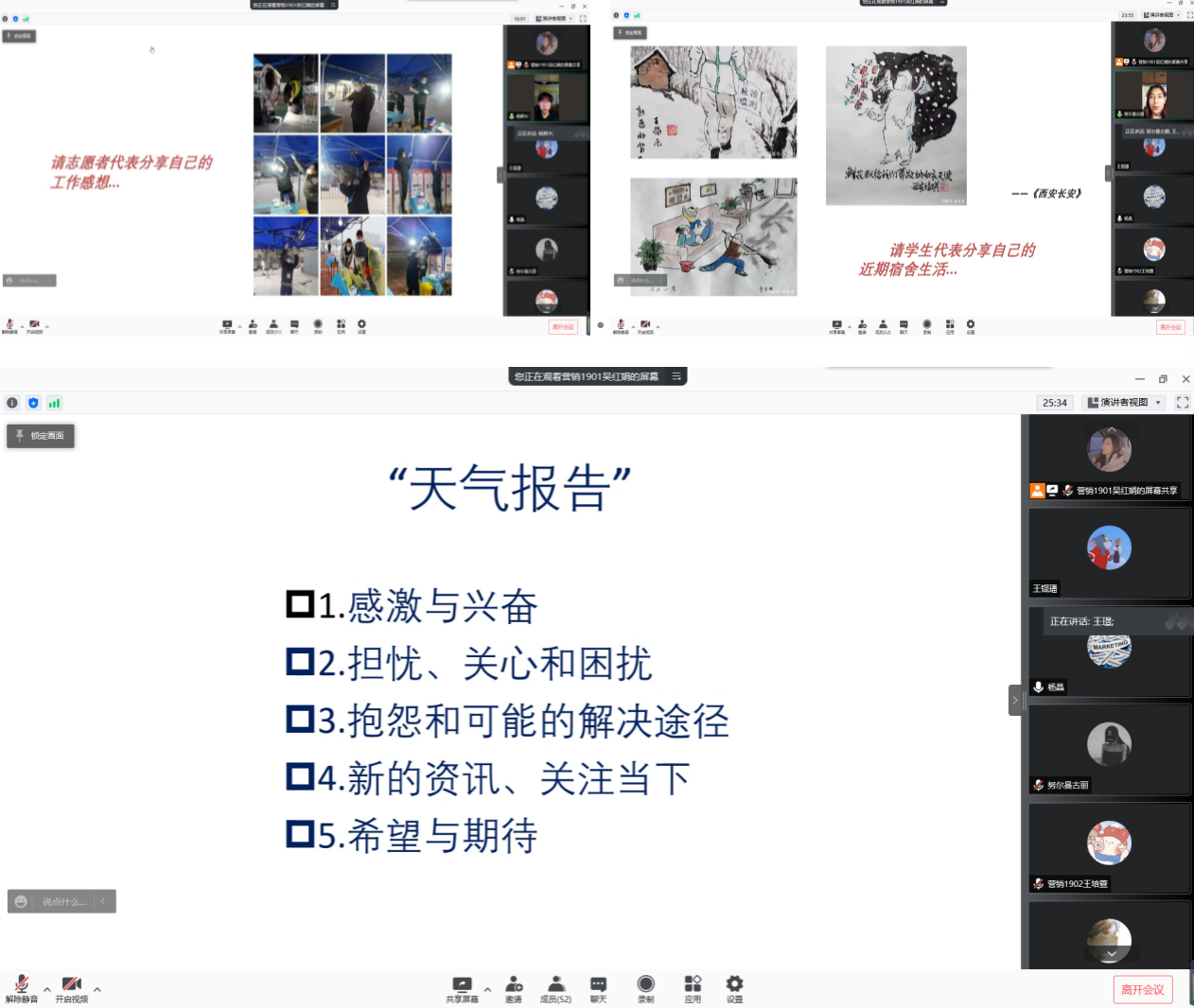市場營銷專業(yè)學生志愿者代表楊輝中、瞿力淵同學與大家分享了志愿服務過程中的心得與收獲,他們積極動員學生干部投身疫情防控志愿服務工作,在宿舍樓值班值守、核酸檢測組織、防疫物資搬運中都有他們的身影。學生代表王彪、努爾曼·古麗分別分享了疫情防控期間的日常宿舍生活。