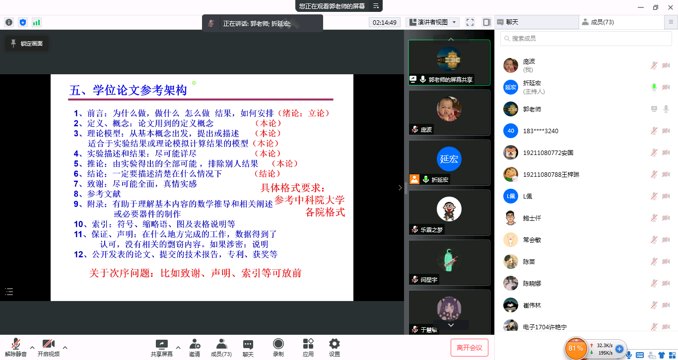 報(bào)告開(kāi)始,郭教授從疫情形勢(shì)出發(fā),談及當(dāng)前學(xué)習(xí)科研和論文撰寫(xiě)存在的不便和困難,針對(duì)性地提出解決辦法和意見(jiàn)建議。接著,郭教授重點(diǎn)針對(duì)研究生學(xué)位論文撰寫(xiě)過(guò)程中常見(jiàn)的問(wèn)題和難題,從論文目的、構(gòu)思方法、寫(xiě)作模式、體現(xiàn)方式等不同側(cè)面,以要點(diǎn)概括與論文實(shí)例相結(jié)合的形式,兼論正文格式文體要訣,從“研究生與學(xué)術(shù)研究”“需牢記的事情”“學(xué)位論文的要求和特點(diǎn)”“寫(xiě)學(xué)位論文的步驟”“參考結(jié)構(gòu)”等7個(gè)方面詳細(xì)全面地講述了如何寫(xiě)出一篇優(yōu)秀的學(xué)術(shù)論文。最后,郭教授與同學(xué)們進(jìn)行了交流互動(dòng),在線解答了學(xué)生們的各類(lèi)疑惑和問(wèn)題。同學(xué)們興致盎然、反響熱烈。
