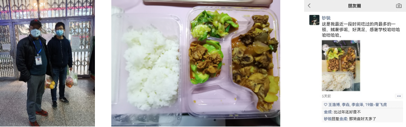 ——送餐上門,鼓舞抗疫信心。學(xué)院為被隔離的130名研究生購買盒飯,為他們送上可口暖心的飯菜,鼓舞學(xué)生們堅(jiān)定信心,克服困難,同心抗疫。