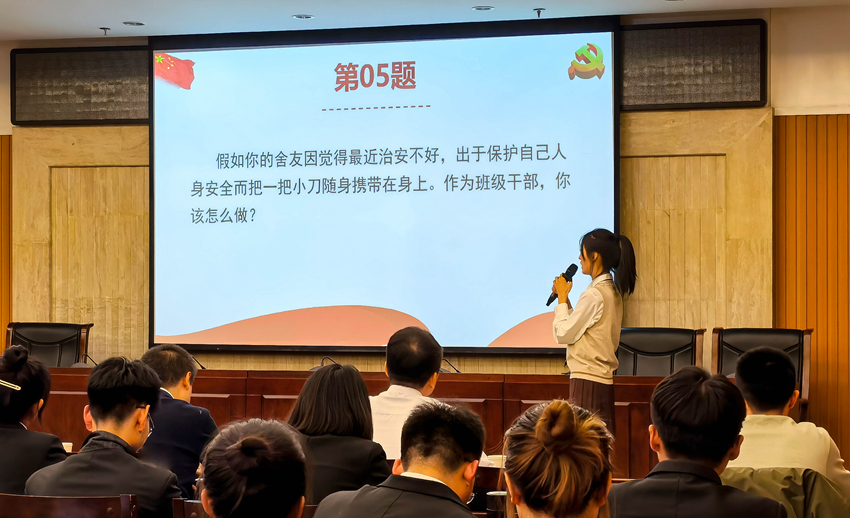 本次活動(dòng)主要分為班級(jí)干部素質(zhì)能力大賽決賽和班級(jí)建設(shè)大賽匯報(bào)展示兩大部分。首先進(jìn)行的是班級(jí)干部素質(zhì)能力大賽決賽,包含“班情熟知”和“案例分析”兩個(gè)環(huán)節(jié),分別考察班級(jí)干部對(duì)班級(jí)每位成員基本情況的了解程度和班級(jí)干部在面對(duì)班級(jí)日常管理、穩(wěn)定安全、疫情防控、班風(fēng)學(xué)風(fēng)、同學(xué)關(guān)系等問(wèn)題時(shí)的思路、原則、方法和啟示。