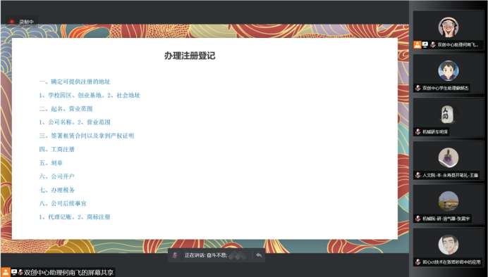 課中,劉老師對(duì)創(chuàng)業(yè)學(xué)生非常關(guān)心的“是否要注冊(cè)公司?”這一問題展開論述,建議學(xué)員們結(jié)合項(xiàng)目的實(shí)際情況進(jìn)行選擇。對(duì)于擬注冊(cè)公司的學(xué)員,劉老師從注冊(cè)地址、公司名稱、營業(yè)范圍、產(chǎn)權(quán)證明、工商注冊(cè)、刻章、公司開戶、代賬公司等環(huán)節(jié)出發(fā),結(jié)合自身創(chuàng)業(yè)經(jīng)歷娓娓道來。同時(shí),推薦大學(xué)生創(chuàng)業(yè)者以“輕資產(chǎn)、低成本”的方式注冊(cè)公司,并在項(xiàng)目初始建立規(guī)章制度,明確成員分工。