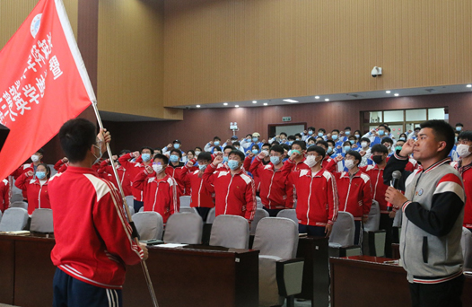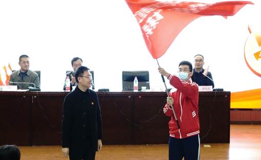 校團(tuán)委書(shū)記何國(guó)強(qiáng)向?qū)W員代表授班旗,這標(biāo)志著班級(jí)有著共同的價(jià)值認(rèn)同,將旗幟舉過(guò)頭頂,將責(zé)任擔(dān)在肩上。