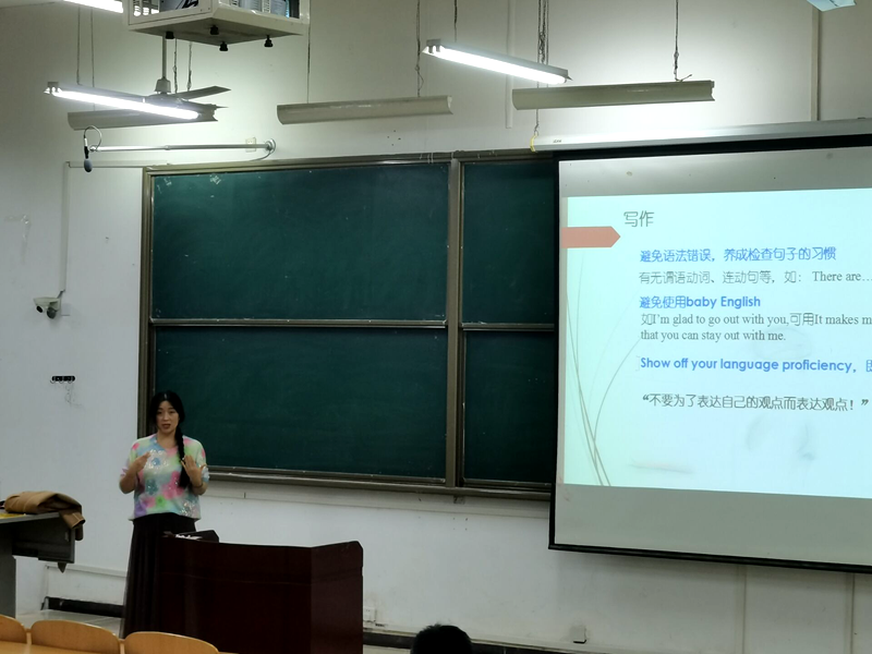 畢瑩老師以“知己知彼,此戰(zhàn)不殆——四級考試題型介紹及應考思路”為題,分別從考試流程、注意事項、寫作翻譯、應試技巧、重點語法等五個方面對CET-4考試作了介紹,系統(tǒng)地分析了四級考試流程及注意事項,全面總結(jié)了四級考試題型以及應答技巧,讓學生對于CET-4考試有了一個基礎(chǔ)性的認識。