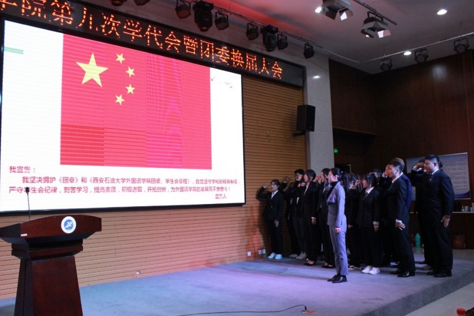 院第九屆學(xué)生會指導(dǎo)老師陶李宣讀了《西安石油大學(xué)外國語學(xué)院第九次學(xué)代會暨團委換屆大會選舉辦法》。隨后15位競選人進行競選演講,表達為學(xué)院團學(xué)工作貢獻力量的決心與熱情。最終,經(jīng)過民主投票,差額選舉確定龐詩凡、徐子涵、睢佳等13位同學(xué)為外國語學(xué)院第九屆團委、學(xué)生會委員。陶李老師帶領(lǐng)當(dāng)選委員進行宣誓。