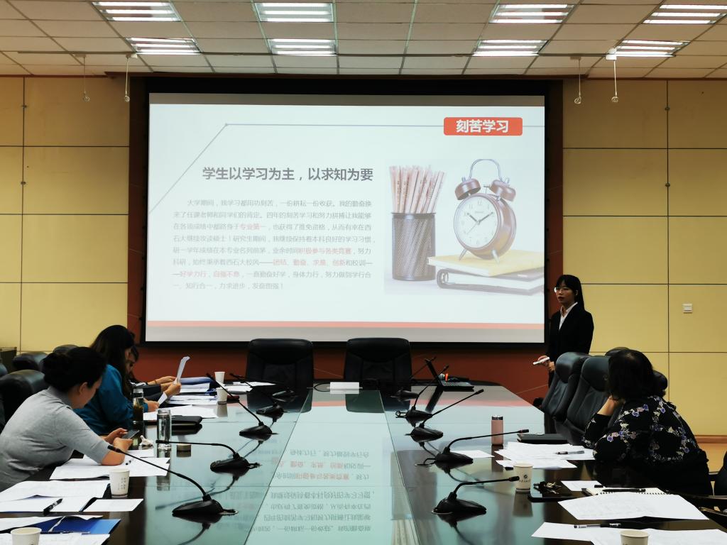 會上,高榮芳部長傳達(dá)了本次王濤英才獎學(xué)金評選相關(guān)要求,并將各院系推薦參與本次答辯研究生情況作了總體介紹。隨后,參評研究生按現(xiàn)場抽簽順序進(jìn)行答辯。同學(xué)們通過精心準(zhǔn)備的PPT,從思想政治、學(xué)術(shù)成果、學(xué)習(xí)成績、社會實(shí)踐、綜合素養(yǎng)等方面展示了自己取得的各項(xiàng)成果。評審委員會通過聽取擬獲獎候選人答辯,對參加答辯的7名“王濤英才”獎學(xué)金候選研究生進(jìn)行了打分排序,最終產(chǎn)生了1名“王濤英才”獎學(xué)金擬獲獎學(xué)生。