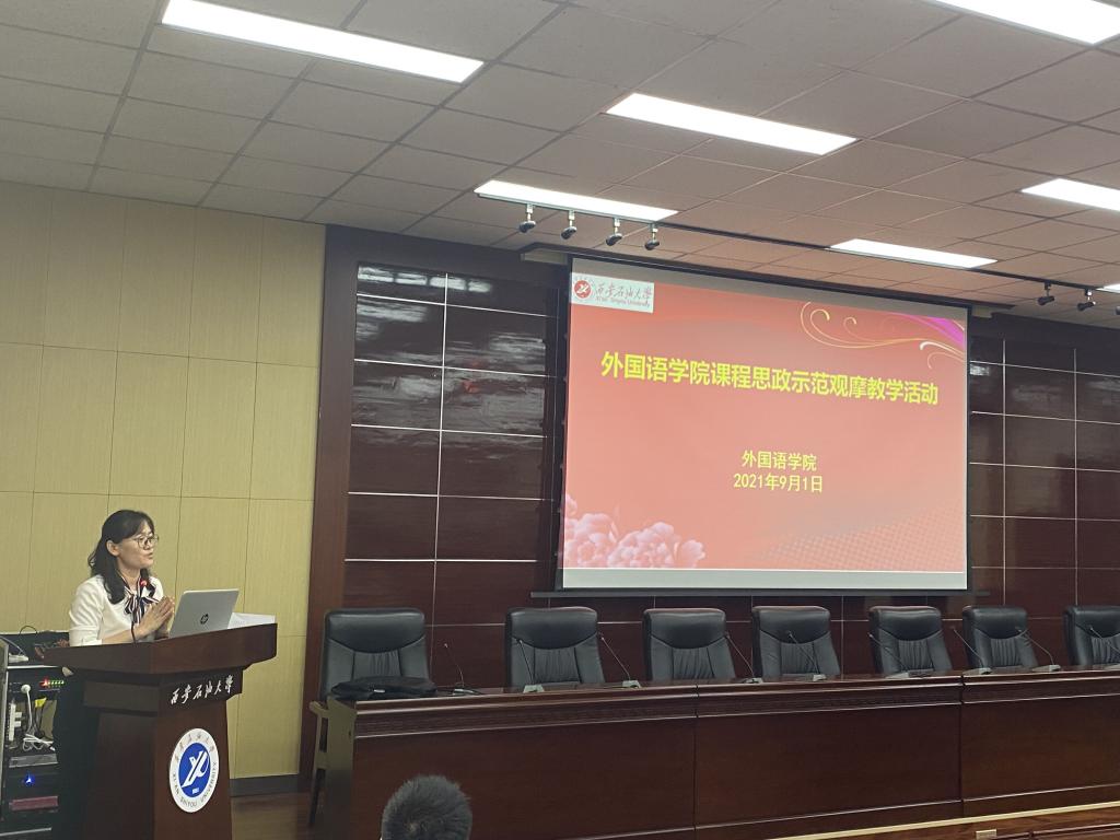 教學(xué)觀摩前,教務(wù)處副處長吳勛和外國語學(xué)院院長于艷英分別從國際形勢,外語教學(xué)等方面強(qiáng)調(diào)了課程思政的重要性做了講話。教學(xué)示范觀摩活動(dòng)特邀請我院在西安石油大學(xué)課程思政大練兵競賽獲得二等獎(jiǎng)的周曉寒老師和在西安石油大學(xué)青年教師教學(xué)競賽一等獎(jiǎng)的陳旭老師以及在“外教社杯”全國高校外語教學(xué)大賽陜西賽區(qū)三等獎(jiǎng)苗旸老師為大家做課程思政展示,老師們在教學(xué)活動(dòng)中將中外文化相結(jié)合,把課程思政融入到外語教學(xué)中,引導(dǎo)學(xué)生用外語講述中國故事,用外語傳播中國文化。