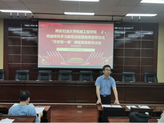 為熱烈慶祝中國共產(chǎn)黨成立100周年,全面落實習(xí)近平總書記在黨史學(xué)習(xí)教育動員大會上的重要講話精神,按照西安石油大學(xué)《關(guān)于2021學(xué)年秋季學(xué)期開展“開學(xué)第一課”課程思政教育活動的通知》的相關(guān)要求,8月31日下午,機(jī)械工程學(xué)院在雁塔校區(qū)第五會議室開展“開學(xué)第一課”課程思政觀摩學(xué)習(xí)活動。機(jī)械工程學(xué)院黨委書記蔡建文、院長竇益華及學(xué)院全體教職工參加了學(xué)習(xí)活動。