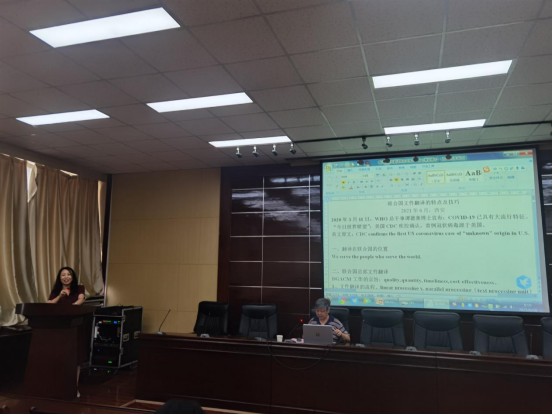 徐老師首先闡述了翻譯作為幕后工作者在聯(lián)合國不可或缺的作用,提出聯(lián)合國文件翻譯的宗旨是質(zhì)量、產(chǎn)量、及時和效益,并以具體實例對聯(lián)合國文件翻譯的特點,如語種平等、敏感度高、時效性強、涉及范圍廣、新概念的翻譯及歷史記憶等逐一進行了闡釋,最后向大家介紹了文件翻譯應(yīng)遵循的原則以及翻譯技巧的運用。