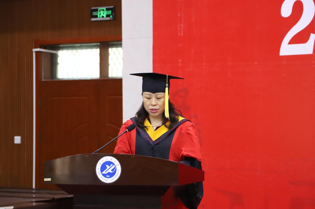 在雄壯的國歌聲中,拉開了2021屆本科畢業(yè)生學(xué)位授予儀式,于艷英院長代表學(xué)院致辭,為畢業(yè)生送上誠摯祝賀與濃情寄語。她勉勵同學(xué)們要心存“四個感恩”:一是感恩自己,通過四年的努力奮斗和認真學(xué)習(xí),為大學(xué)生涯畫上圓滿句號,獲授文學(xué)學(xué)士學(xué)位,為自己人生征程充滿了力量和動力;二是感恩父母,要銘記父母養(yǎng)育之恩,理解和陪伴,要傳承好孝道,在生活中用實際努力回饋父母;三是感恩學(xué)校,感恩學(xué)校老師四年的諄諄教誨,要學(xué)會尊師重道,繼續(xù)傳承和弘揚西安石油大學(xué)辦學(xué)精神;四是感恩國家,感恩社會,和諧幸福的社會讓同學(xué)們可以靜心求學(xué),增長才干,要牢記責(zé)任和使命,做新中國特色社會主義合格建設(shè)者和可靠接班人,在中華民族偉大復(fù)興的事業(yè)中貢獻力量和成就自我。于院長還對學(xué)生們提出了殷切期望,她希望學(xué)子們能夠秉承外語人學(xué)貫中西,積極向上的態(tài)度,牢記老師和家長的重托,希望學(xué)子們用自己的專業(yè)知識,為社會,為國家奉獻自己的力量,敢于創(chuàng)新,銳意進取,為母校爭光!