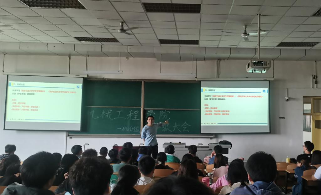 根據(jù)學(xué)校進一步嚴肅校規(guī)校紀加強學(xué)生教育管理專項教育的統(tǒng)一安排,機械工程學(xué)院于4月19日起陸續(xù)召開學(xué)生工作例會、線上線下結(jié)合的各級年級大會、各班班會、學(xué)生干部會議,認真學(xué)習(xí)《學(xué)生手冊》中《西安石油大學(xué)學(xué)生管理規(guī)定》、《西安石油大學(xué)學(xué)生違紀處分規(guī)定》等學(xué)生管理內(nèi)容,并進行校運動會、“五一”假期等安全紀律教育,同時安排各年級的重要事項。各年級輔導(dǎo)員主持相關(guān)會議。