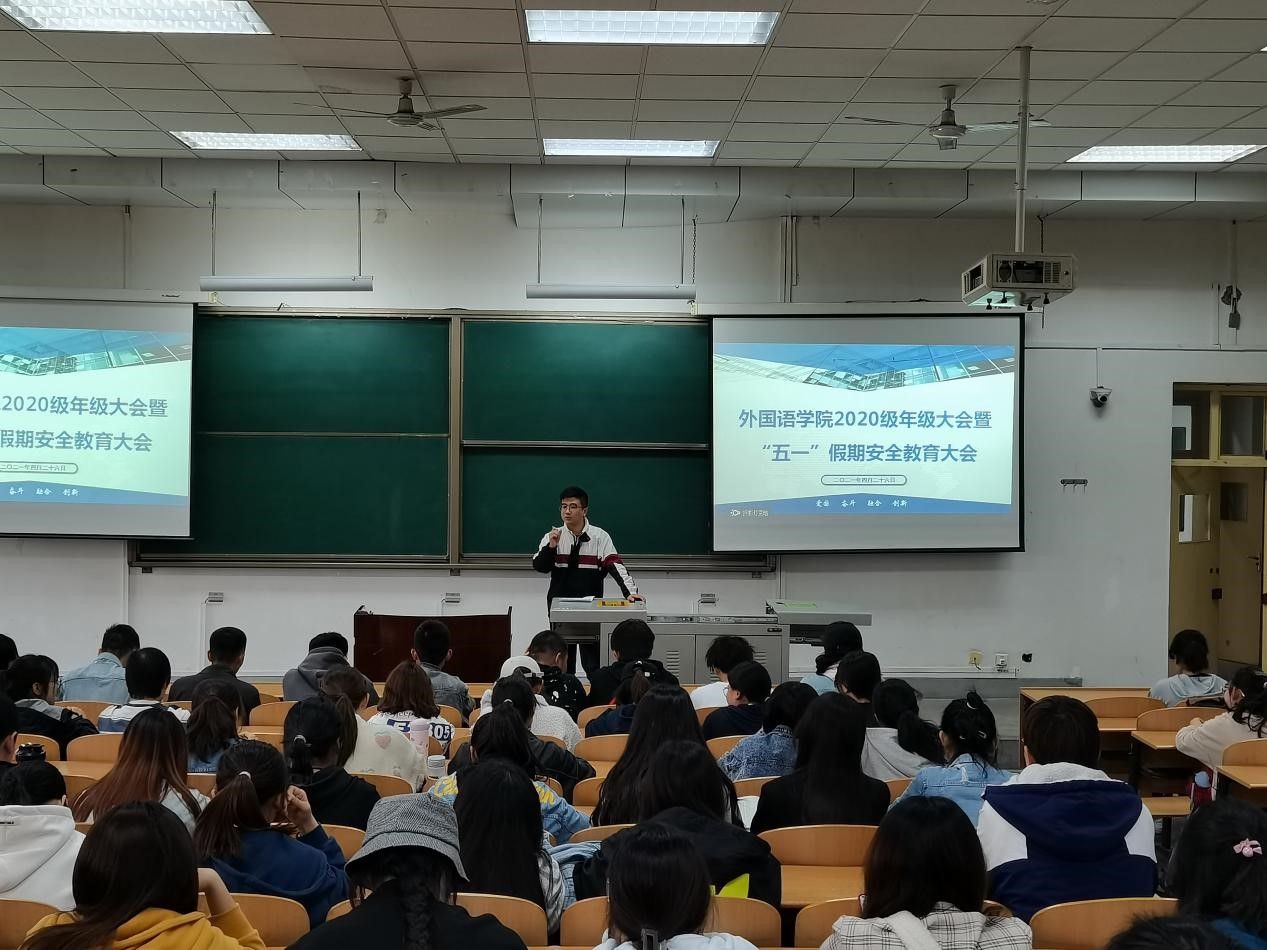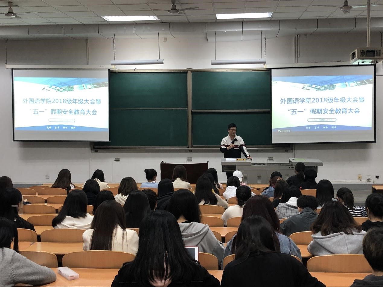 外國語學(xué)院通過召開日常安全教育管理和 “五一”假期專項安全教育大會等工作,認(rèn)真排查學(xué)院安全隱患點,強(qiáng)調(diào)學(xué)風(fēng)建設(shè)工作,積極營建積極向上的學(xué)院院風(fēng),鼓勵同學(xué)們積極參與學(xué)科競賽,創(chuàng)新創(chuàng)業(yè)競賽以及各項文體活動。希望同學(xué)們以獨立、自律要求自己,時刻牢記并遵守“品行端,學(xué)風(fēng)正,紀(jì)律嚴(yán)”,腳踏實地,奮力成長。