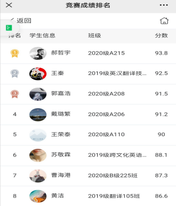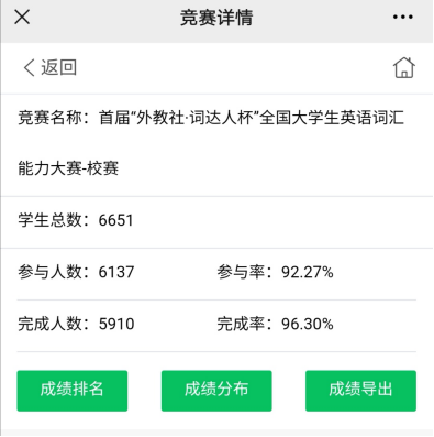 此次大賽全程采用線上競(jìng)賽模式,設(shè)置多種詞匯題型,隨機(jī)出題,競(jìng)賽平臺(tái)綜合學(xué)生答題分?jǐn)?shù)和答題時(shí)間進(jìn)行排名。本次參賽學(xué)生以2019級(jí)和2020級(jí)學(xué)生為主,在線注冊(cè)6651人,共計(jì)6137人參加,5910人完成比賽,參與率為92.27%,完成率為96.30%。校賽成績(jī)排名前200的學(xué)生直接晉級(jí)省賽,由平臺(tái)直接推送復(fù)賽邀請(qǐng)給晉級(jí)學(xué)生。按照我院大學(xué)英語(yǔ)的教學(xué)安排,此次參賽同學(xué)記大學(xué)英語(yǔ)課外實(shí)踐分2分。