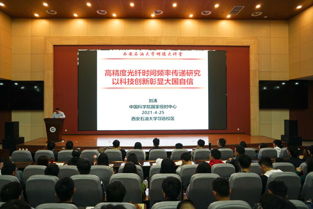 4月25日下午,由校團(tuán)委和理學(xué)院主辦、理學(xué)院團(tuán)委承辦的我校第七十期“明德大講堂”《高精度光纖時間頻率傳遞研究——以科技創(chuàng)新彰顯大國自信》在鄠邑校區(qū)圖書館弘石報(bào)告廳精彩開講。本期嘉賓是中國科學(xué)院國家授時中心二級研究員、中國科學(xué)院大學(xué)劉濤教授,理學(xué)院黨委副書記馬小剛主持報(bào)告會,全校400余名研究生和本科學(xué)生共同聆聽了精彩講座。