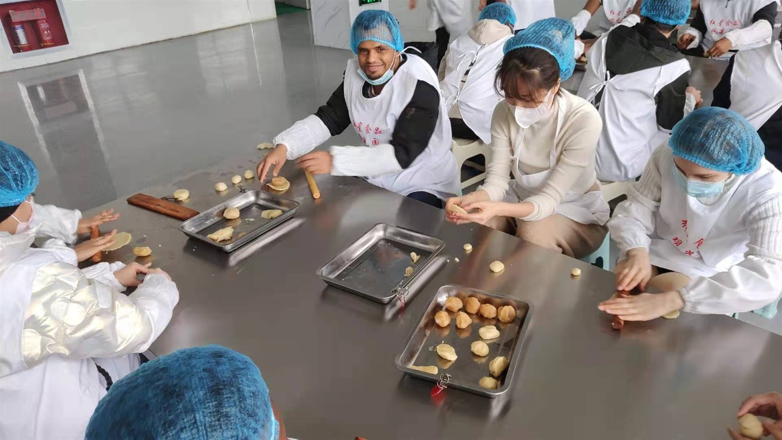 留學(xué)生們首先參觀了紅星軟香酥集團(tuán)企業(yè)文化展廳,了解了企業(yè)發(fā)展歷史及中國文化展示。隨后來到該公司無菌車間食品生產(chǎn)流水線,聽取了講解員對(duì)公司生產(chǎn)流程、制造工藝、質(zhì)量控制等情況的詳細(xì)介紹。公司高端智能現(xiàn)代化生產(chǎn)線、整潔有序安全衛(wèi)生的生產(chǎn)環(huán)境給大家留下了深刻印象。隨后,留學(xué)生們穿上白色無菌服,前往DIY工坊親手制作軟香酥月餅,現(xiàn)場(chǎng)體驗(yàn)手工烘焙的樂趣。