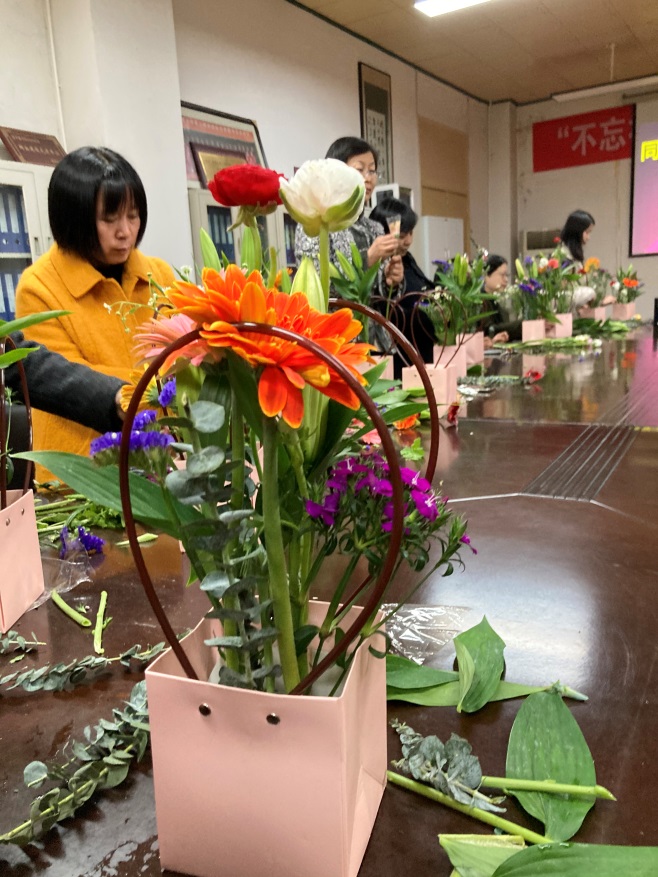 3月8日早上11點,窗外下起的蒙蒙細雨為插花活動覆上一層濃郁的浪漫色彩?;顒娱_始,蔣館長為女教工獻上真摯的節(jié)日祝語。女教工個個興致盎然,充分發(fā)揮想象和創(chuàng)意,精巧構(gòu)思,利用白百合、洋甘菊、勿忘我、非洲菊、相思梅、洋牡丹、多頭康、尤加利葉等花材,通過精心剪葉、裁枝、搭配、裝飾后,將原本普通的花葉打造成各種形態(tài)優(yōu)美、賞心悅目的插花作品。成品或是錯落有致、或是色彩繽紛。女教工手捧親自制作的這份有趣味、有意義、有溫暖,承載美好祝福的節(jié)日禮物,臉上流淌著滿滿的幸福感和成就感?;顒蝇F(xiàn)場歡聲笑語,洋溢著輕松愉悅的節(jié)日氛圍。