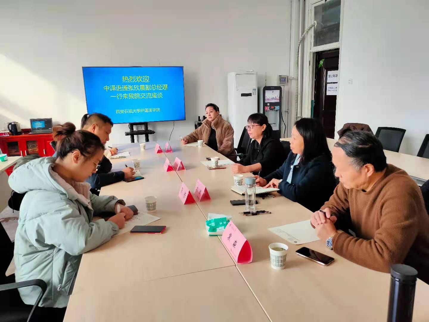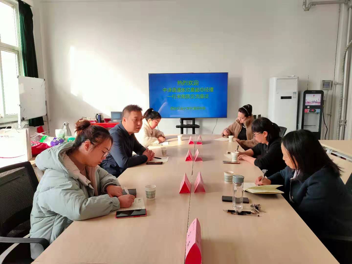 2月3日上午,中譯語(yǔ)通科技(陜西)有限公司副總經(jīng)理張欣晨、語(yǔ)言產(chǎn)品中心經(jīng)理陳棟、銷售經(jīng)理谷彩霞一行到訪外國(guó)語(yǔ)學(xué)院。外國(guó)語(yǔ)學(xué)院院長(zhǎng)于艷英、副院長(zhǎng)劉輝、翻譯碩士教育中心主任袁森、英語(yǔ)專業(yè)負(fù)責(zé)人董梅、英語(yǔ)系副主任鄧林參加了交流座談。