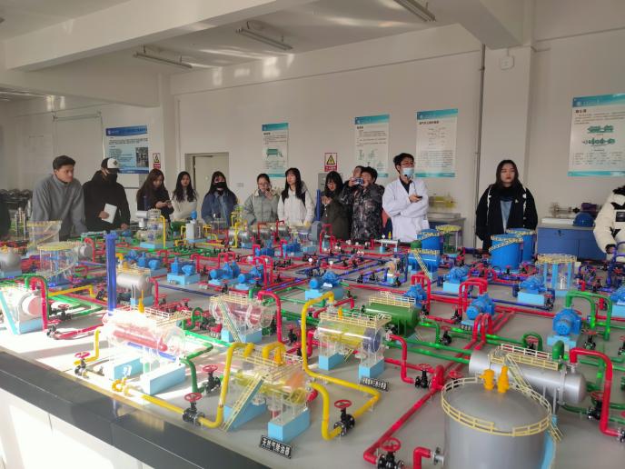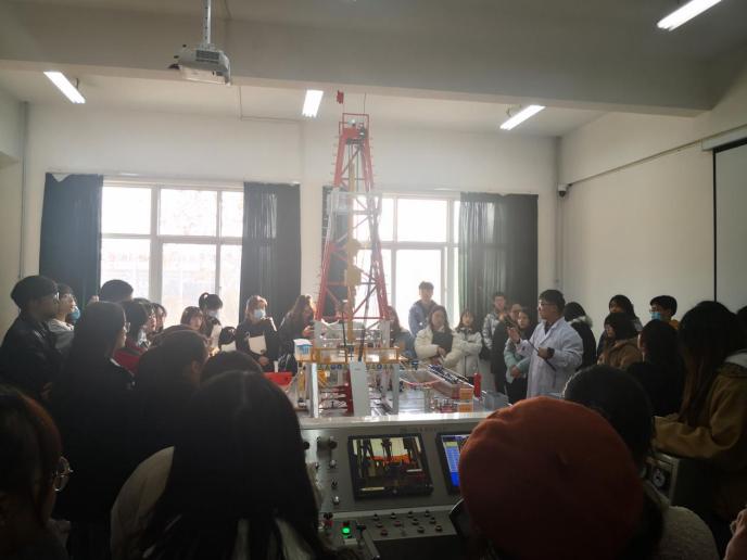 工程訓(xùn)練中心的張磊老師帶領(lǐng)同學(xué)們先后參觀了鉆井、集輸、采油、儲(chǔ)運(yùn)及油氣田開發(fā)實(shí)訓(xùn)室,趙棟老師帶領(lǐng)同學(xué)們分別參觀了采油集輸實(shí)訓(xùn)平臺(tái)和地球科學(xué)科普教育地質(zhì)實(shí)訓(xùn)平臺(tái)。其中,地質(zhì)實(shí)訓(xùn)平臺(tái)陳列著許多礦物巖石信息,極大地豐富了野外實(shí)際地礦內(nèi)容,而多技術(shù)的融合也極大地提升了同學(xué)們參觀時(shí)的興趣和熱情。在參觀過程中,同學(xué)們認(rèn)真聆聽老師的講解、并結(jié)合自身感興趣的問題向老師詢問了油田勘探、開采、集輸?shù)南嚓P(guān)知識(shí)。