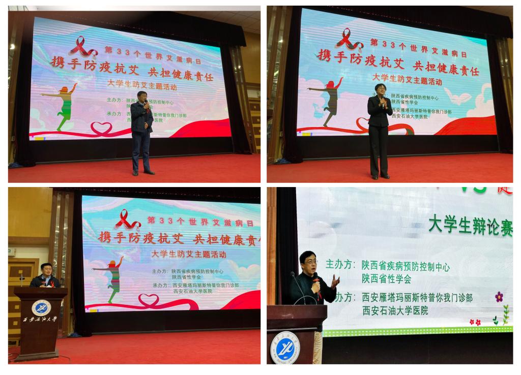 本次主題活動(dòng)在西安石油大學(xué)雁塔校區(qū)會(huì)議中心學(xué)術(shù)報(bào)告廳舉行,邀請(qǐng)了陜西省疾病預(yù)防控制中心副主任常文輝,陜西省疾病預(yù)防控制中心艾滋病防治所所長(zhǎng)任強(qiáng),西安市疾病預(yù)防控制中心艾滋病防治科科長(zhǎng)張海蘭,西安交通大學(xué)航天航空學(xué)院黨委副書記、大學(xué)生思想教育與實(shí)踐研究中心副主任、陜西省性學(xué)會(huì)副會(huì)長(zhǎng)兼秘書長(zhǎng)陳永華,西安交通大學(xué)第一附屬醫(yī)院感染科主任、陜西省性學(xué)會(huì)大學(xué)生健康促進(jìn)專業(yè)委員會(huì)主任委員葉峰,瑪麗斯特普你我門診部主任周安秦蒞臨參加。同時(shí),我校副校長(zhǎng)蘇文甫,校醫(yī)院院長(zhǎng)崔廣志和校醫(yī)院住院部主任成怡敏到會(huì)參加。