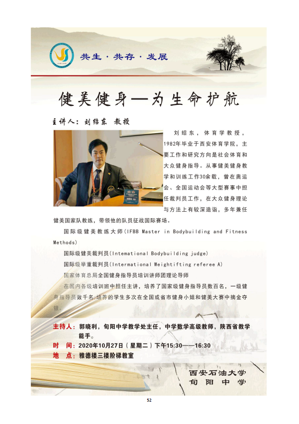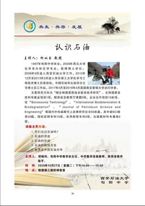 10月26日-28日,我校受邀參加旬陽中學(xué)第十一屆體育藝術(shù)科技節(jié)。招生辦公室認(rèn)真組織,按照活動安排,邀請?bào)w育系劉紹東教授和旬陽中學(xué)校友、化學(xué)化工學(xué)院柯從玉博士分別作了專題報(bào)告,科技活動展示了嚴(yán)正國老師的學(xué)術(shù)成果"彩色全幀率測井電纜井下電視成像測井系統(tǒng)”。