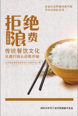 圍繞“拒絕餐飲浪費(fèi)”主題,材料科學(xué)與工程學(xué)院在微信公眾平臺(tái)、QQ群等進(jìn)行宣傳,并發(fā)出倡議。在全體學(xué)生中營(yíng)造厲行節(jié)約、反對(duì)浪費(fèi)、崇尚節(jié)儉的良好氛圍,樹(shù)立“一粥一飯當(dāng)思來(lái)之不易,半絲半縷恒念物力維艱”的勤儉節(jié)約意識(shí)。