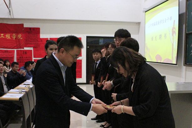 大會上聽取并審議了學(xué)院二十三屆團委學(xué)生會年度工作報告。同時,李剛老師對上年度工作進行總結(jié),并宣讀了第二十四屆院團委學(xué)生會主要學(xué)生干部的任免決定。接著,與會領(lǐng)導(dǎo)老師向新一屆學(xué)生干部頒發(fā)了聘書。