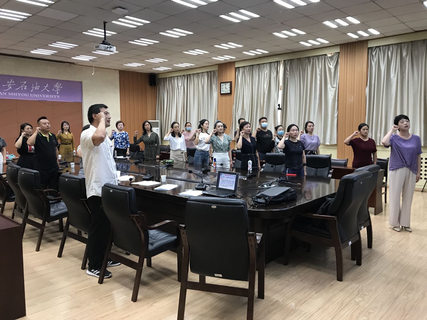 最后,在領(lǐng)誓人2020年校級師德先進(jìn)個(gè)人駱珞老師的帶領(lǐng)下,教師全體肅立,右手舉拳,面對國旗莊嚴(yán)宣誓“我志愿成為一名光榮的人民教師,忠誠黨的教育事業(yè),貫徹黨的教育方針,履行教師的神圣職責(zé)......”。