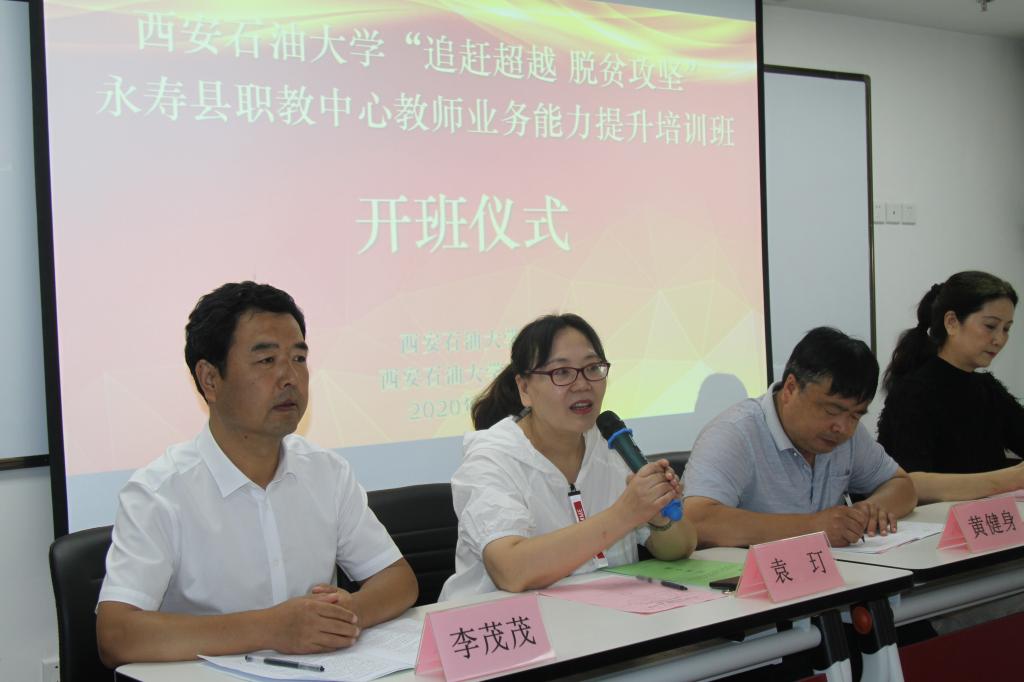 開班儀式上,袁玎主席做了熱情洋溢的致辭。她代表校工會歡迎各位學員的到來,并給學員們介紹了西安石油大學了歷史沿革和目前辦學規(guī)模和特色,希望學員們今后能關心支持學校的發(fā)展。黃健身副主任代表永壽縣教育局致答謝辭,他回顧了脫貧攻堅以來,西安石油大學為永壽社會經濟發(fā)展所辦的實事好事,并要求全體學員珍惜這次培訓的機會,認真參加培訓,確保這次培訓取得實效。最后,永壽縣職教中心副校長李茂茂,向承擔這次培訓任務的西安石油大學培訓中心贈送了一面題為“培育師資促發(fā)展、真心幫扶助攻堅”的錦旗。