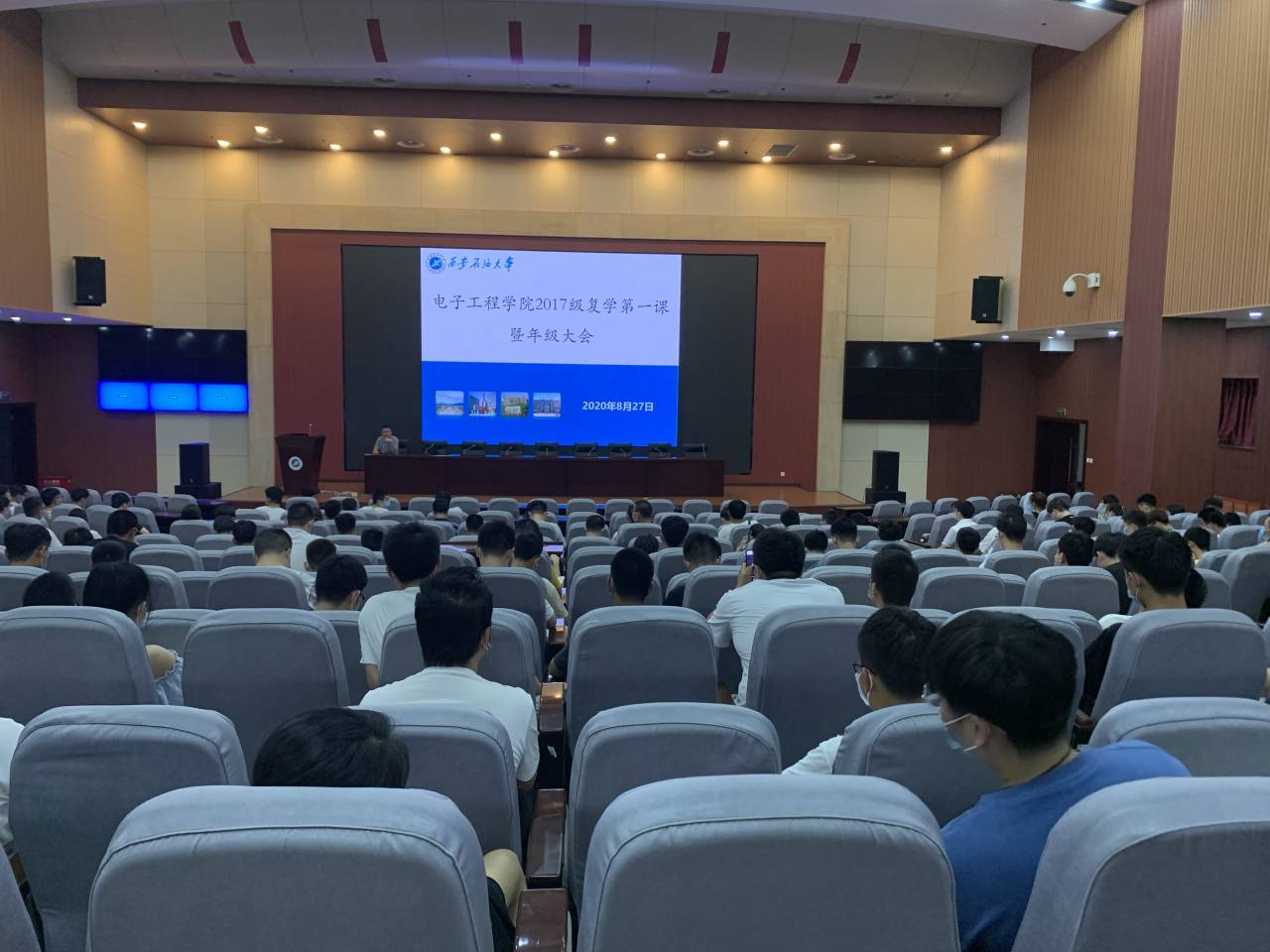 為貫徹落實好學校關于疫情防控工作的具體安排,明確畢業(yè)年級新學期的校園生活規(guī)劃以及就業(yè)指導工作。8月27日晚,電子工程學院2017級在弘石學術報告廳分批次召開了“復學第一課”。會議由2017級輔導員高建邦主持,全體2017級返校學生參加。