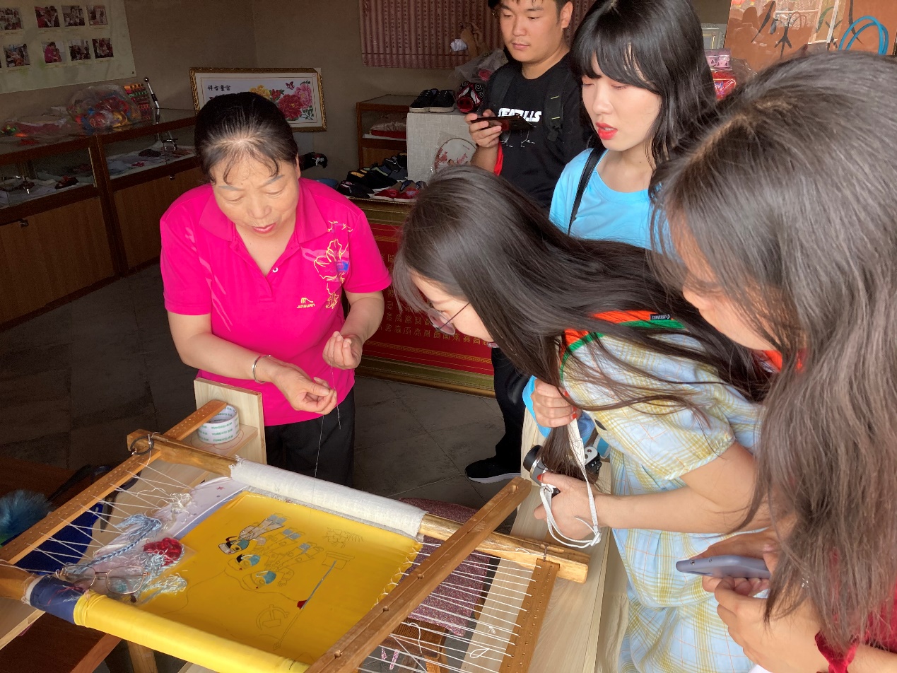 8月1日,團(tuán)隊(duì)于早上九點(diǎn)到達(dá)第一個(gè)調(diào)研地點(diǎn)秦人部落。木樁圍成的一塊與城市相隔的地方,旌旗飄飄,古樸的建筑讓人仿佛穿越到了古代。伴著古典的背景音樂(lè),我們飽覽了秦人軍隊(duì)的雄風(fēng),走過(guò)長(zhǎng)長(zhǎng)的民俗街道,當(dāng)?shù)氐拿朗撑c秦人手工藝品吸引著我們的眼球。其中最讓人記憶深刻的便是姜女秦秀。在這之前,我們只聽(tīng)聞過(guò)蜀繡,蘇繡。今天才了解到秦秀,一個(gè)與孟姜女有關(guān)的傳統(tǒng)繡法。秦秀的特點(diǎn)顯著,例層次多、立體感強(qiáng):秦繡不同于傳統(tǒng)刺繡的長(zhǎng)針摻線,它是在真絲紗絡(luò)上用真絲線依照經(jīng)緯網(wǎng)眼施針,一孔一針或幾孔一針。由于針的走向不同,使圖案花紋,畫(huà)面變幻多端,花中套花。針?lè)ǖ牟煌€使得繡線產(chǎn)生不同反光,同一色線形成不同的色彩效果,彰顯出真絲線材質(zhì)的繽紛美感。秦繡作品中,小花紋的微妙變化與大塊面色彩經(jīng)常對(duì)比運(yùn)用,此時(shí)畫(huà)面生出層次和立體感,增加了整幅繡品格調(diào)的瑰麗典雅。