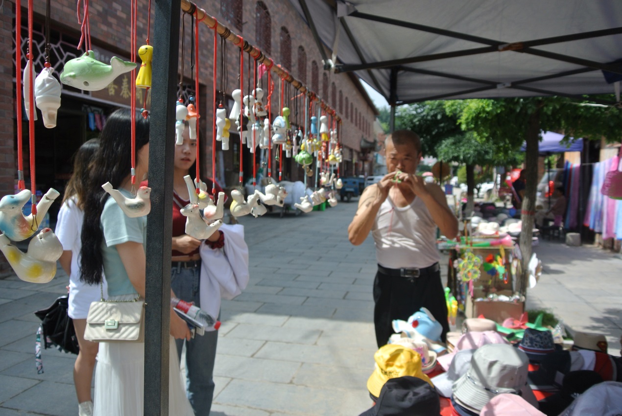 還有各式樣的陶瓷玩具,在販攤上最吸引游客的便是陶笛類(lèi)的樂(lè)器。在一家攤販前,買(mǎi)陶塤的大叔還為我們現(xiàn)場(chǎng)表演了一番那件海豚形狀的陶器樂(lè)器。陶器不僅僅用于器具,觀賞性的擺件,在這里也被發(fā)掘?yàn)橐环N樂(lè)器,豐富的形式讓這件工藝品更具價(jià)值。不由得讓人心動(dòng)購(gòu)買(mǎi)它。在鎮(zhèn)子里還可以親手制作陶器,親身感受陶文化的魅力。這里不需要解說(shuō),那些肉眼可見(jiàn)的陶器,指尖觸碰到的古鎮(zhèn),都訴說(shuō)著這個(gè)古鎮(zhèn)的點(diǎn)點(diǎn)滴滴。