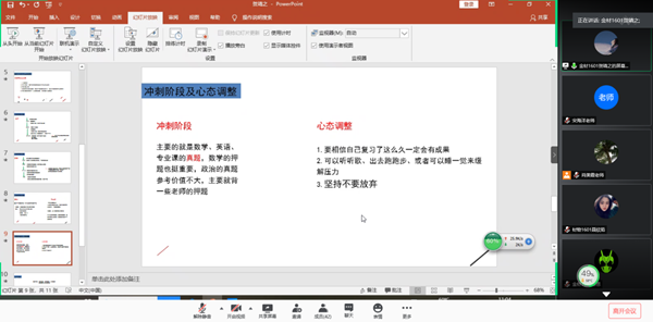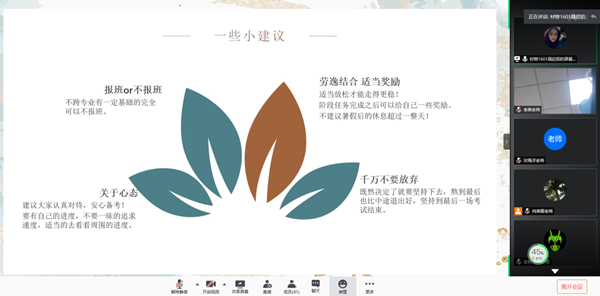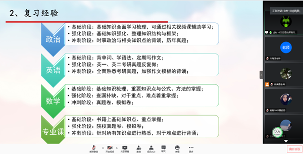 接著,考研優(yōu)秀學(xué)生代表聶欣茹、蘇恩和賀靖之三位同學(xué)為大家做了考研經(jīng)驗(yàn)交流。他們通過(guò)分享自己在考研院校與專業(yè)選擇、初試備考經(jīng)歷、考研心態(tài)調(diào)整、復(fù)試備考及注意事項(xiàng)等方面的心得和經(jīng)驗(yàn),為材料物理1701班學(xué)生考研備戰(zhàn)提供了很好的借鑒和幫助。