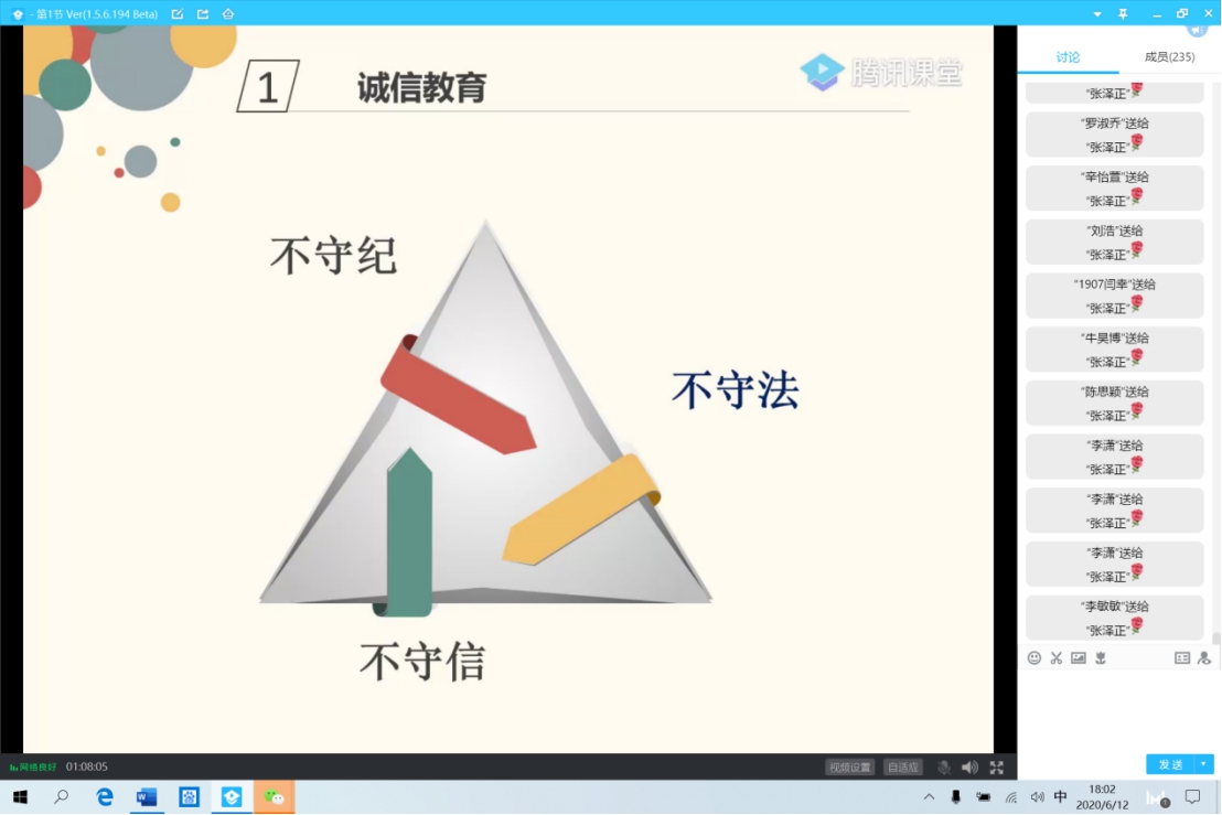 除此之外,范老師和張老師還對同學(xué)們進(jìn)行了誠信教育,強(qiáng)調(diào)誠信重要性。兩位老師分別從考試作弊、“槍手”成風(fēng)、騙貸逃貸等大學(xué)生常見誠信問題出發(fā),教育同學(xué)們樹立正確的是非道德觀念,做遵紀(jì)守法的新時(shí)代社會主義好青年。