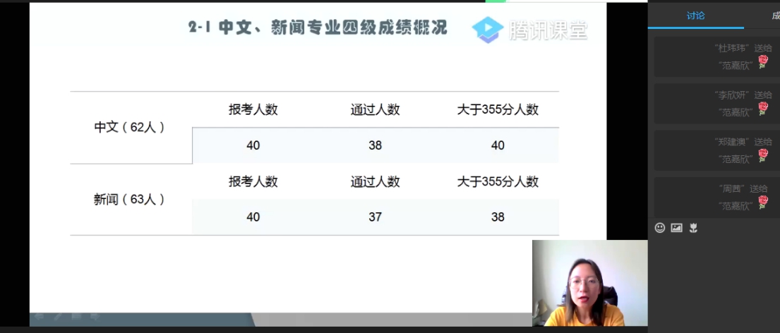 2019級的年級大會首先由盛書記進(jìn)行重要講話。她在期末考試安排、疫情期間的心理健康、英語四級考試和學(xué)生人生規(guī)劃四個(gè)方面做了指示和強(qiáng)調(diào)。盛書記特別指出,英語四級成績在各階段都起著重要作用,督促同學(xué)們抓緊假期時(shí)間備考;她還具體解釋了人生規(guī)劃中需要考慮的四象限因素,期望同學(xué)們以更加科學(xué)的方式進(jìn)行準(zhǔn)確的人生規(guī)劃。隨后,張老師從大一學(xué)年總結(jié)、大二要求、目標(biāo)教育方面向同學(xué)們作了細(xì)致講解。張老師展示了大一課外活動剪影,分析了各專業(yè)班級學(xué)科通過率,分享了四級成績高分榜、宿舍內(nèi)務(wù)評比情況,并對曠課處罰、考試紀(jì)律、推免研究生及學(xué)位授予條件等進(jìn)行了細(xì)致說明,希望同學(xué)們在遵守學(xué)校紀(jì)律的情況下,積極進(jìn)取,認(rèn)真學(xué)習(xí),爭做本專業(yè)的佼佼者,享受大學(xué)時(shí)光。