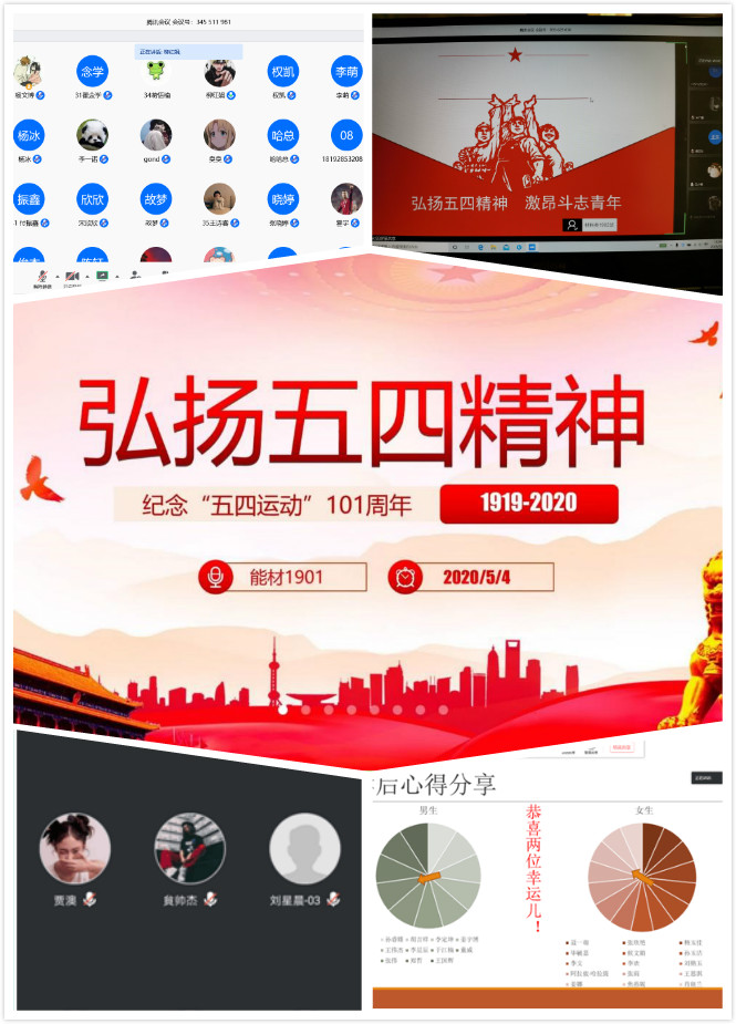 為紀念五四運動101周年,進一步引導廣大青年團員繼承和發(fā)揚五四精神,展現(xiàn)當代青年風采。2020年5月,材料科學與工程學院各班、團支部召開了以“傳承五四精神,弘揚愛國情懷”、“青春向黨、歌頌五四”等為主題的線上班團會。此次主題班團會準備充分,內(nèi)容充實,形式多樣。通過線上學習習近平總書記五四寄語和優(yōu)秀青年事跡、唱團歌、經(jīng)典誦讀、知識競答、觀看五四精神紀錄片等方式,號召廣大團員不忘入團初心、牢記團員使命,以實際行動傳承五四精神、弘揚愛國情懷。