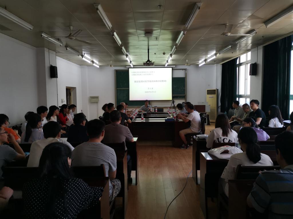 6月5日上午,副校長蘇文甫以《新冠疫情對(duì)世界格局和秩序的影響》為題,在雁塔校區(qū)2教402室為計(jì)算機(jī)學(xué)院全體教工黨員講授專題黨課。計(jì)算機(jī)學(xué)院黨委書記蔡建文主持本次黨課學(xué)習(xí)。