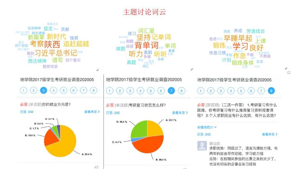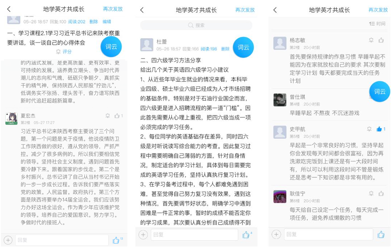 學(xué)院學(xué)工辦在超星學(xué)習(xí)通平臺(tái)建立“地學(xué)英才共成長(zhǎng)”課程門戶。首先,各年級(jí)學(xué)生共同學(xué)習(xí)了習(xí)近平總書記來陜考察重要講話,并在主題討論模塊發(fā)表學(xué)習(xí)心得。隨后,學(xué)工辦老師針對(duì)不同年級(jí)發(fā)布主題討論話題。2019級(jí)學(xué)生專題討論:“居家網(wǎng)課期間,少了老師的引導(dǎo)和同學(xué)的陪伴,你是怎樣進(jìn)行自我管理的,關(guān)于學(xué)習(xí)習(xí)慣的養(yǎng)成你又有什么好的方法?”2018級(jí)學(xué)生專題學(xué)習(xí)輔導(dǎo)員老師撰寫的英語四六級(jí)學(xué)習(xí)經(jīng)驗(yàn)分享網(wǎng)文,并跟帖分享自己英語學(xué)習(xí)的好方法。2017級(jí)學(xué)生填寫就業(yè)考研意向的調(diào)查問卷。各年級(jí)學(xué)生在APP內(nèi)跟帖發(fā)言,互動(dòng)效果良好。