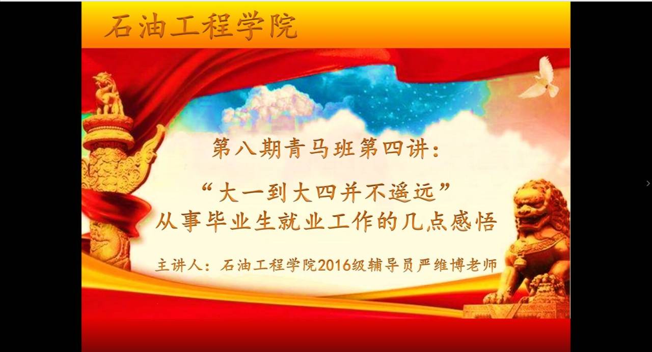 為提升學(xué)生干部在學(xué)習(xí)和工作中的統(tǒng)籌規(guī)劃能力,525日晚,石油工程學(xué)院第八期初級青馬班第四講如期在騰訊會議的線上平臺順利開展。我院2016級輔導(dǎo)員嚴維博老師為大家作了題為大一到大四并不遙遠的主題培訓(xùn),并與同學(xué)們分享了從事畢業(yè)生就業(yè)工作的幾點感悟,2019120余名學(xué)生干部參加了此次培訓(xùn)活動。